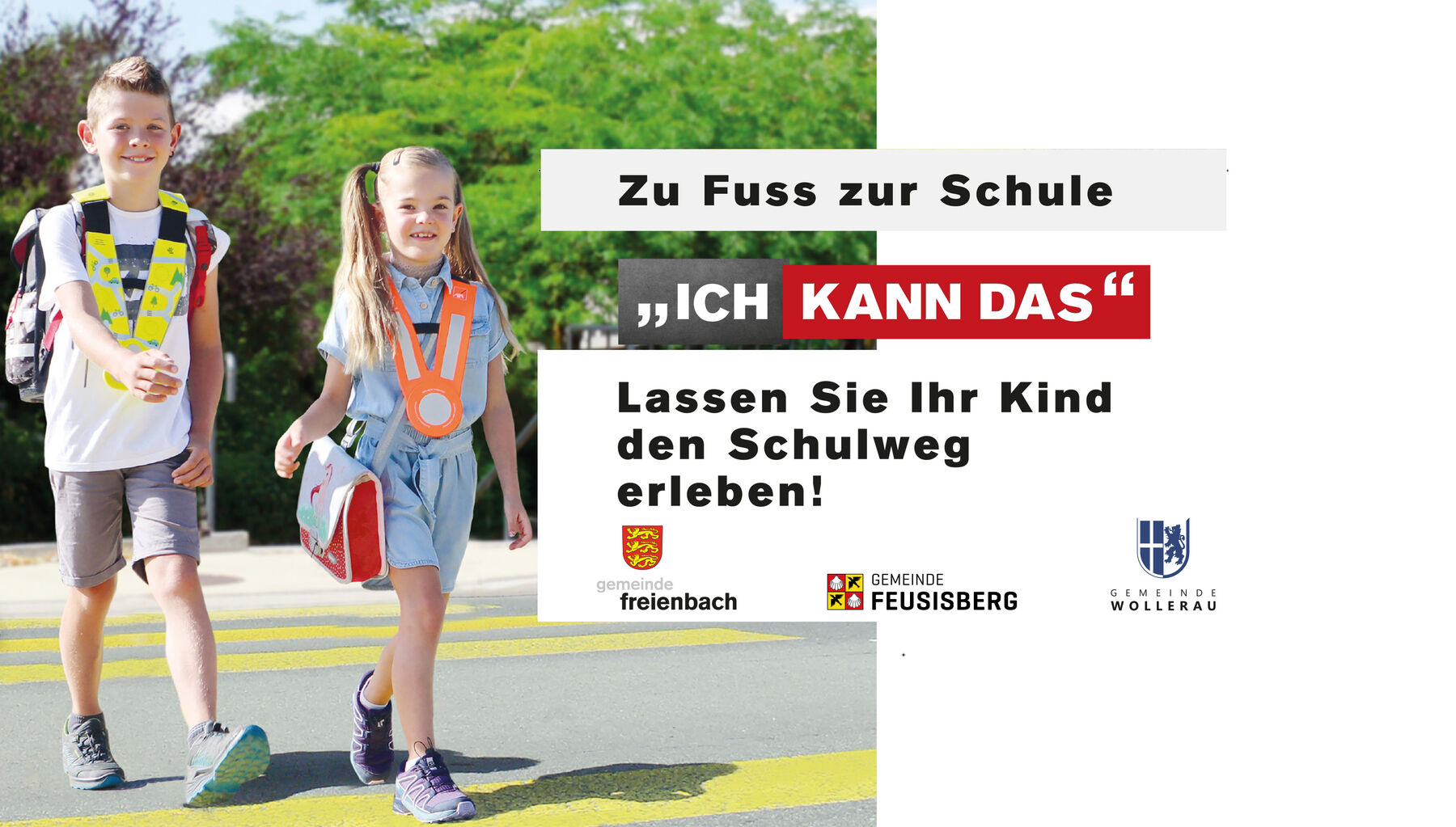 Unter dem bewährten Motto «Ich kann das!» machen die Gemeindeschulen Freienbach, Feusisberg und Wollerau mit Plakaten und Bannern auf die Bedeutung des selbständigen Schulwegs aufmerksam und rufen alle Eltern dazu auf, ihren Kindern das Erlebnis «Schulweg» zu ermöglichen. Gleichzeitig danken die Schulen den Eltern dafür, dass sie damit zur Entschärfung der Verkehrssituation rund um die Schulhäuser beitragen.