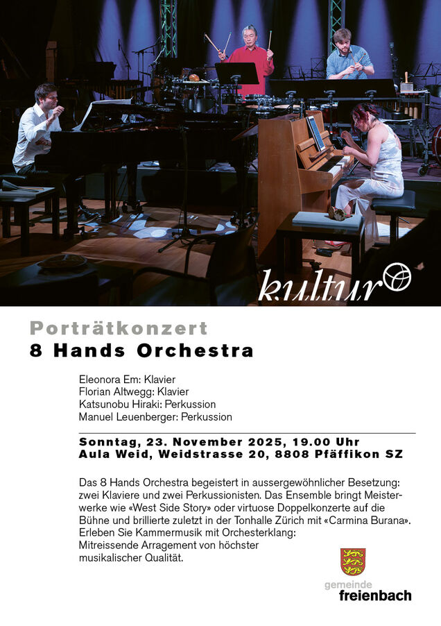 Einladung zum Porträtkonzert von Eleonora Em, Florian Altwegg und Katsunobu Hiraki. Zusammen mit Manuel Leuenberger bilden sie das «8 Hands Orchestra». Diese begeistert in aussergewöhnlicher Besetzung: zwei Klaviere und zwei Perkussionisten. Das Ensemble bringt Meisterwerke wie «West Side Story» oder virtuose Doppelkonzerte auf die Bühne und brillierte zuletzt in der Tonhalle Zürich mit «Carmina Burana». Erleben Sie Kammermusik mit Orchesterklang: Mitreissende Arrangements von höchster musikalischer Qualität.